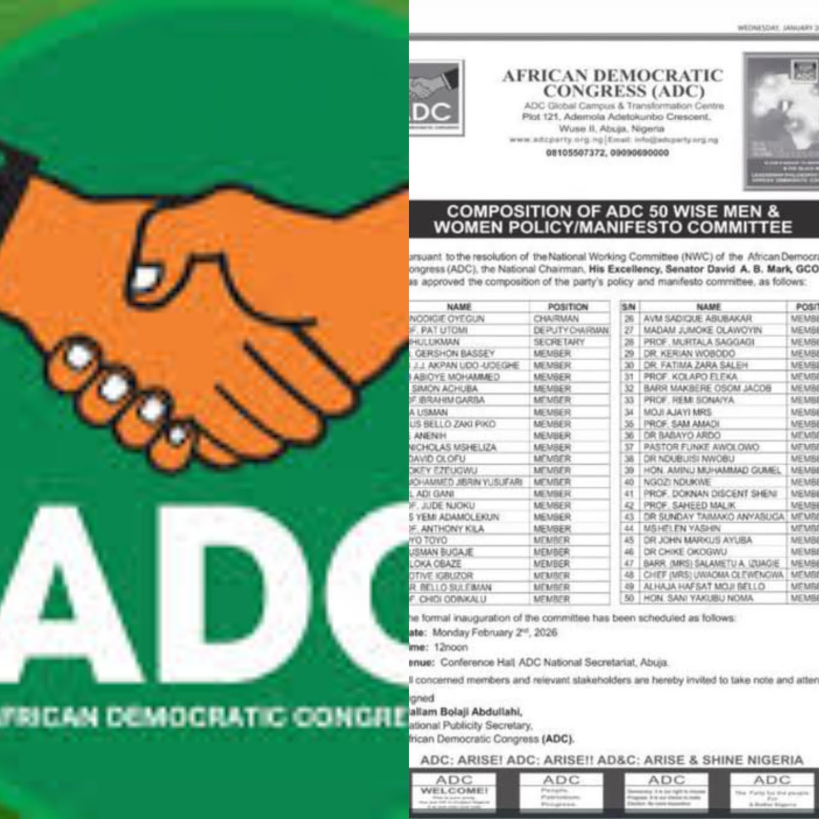 The party also announced that the formal inauguration of the committee will take place on Monday, February 2, 2026, at 12 noon, at the Conference Hall of the ADC National Secretariat in Abuja.