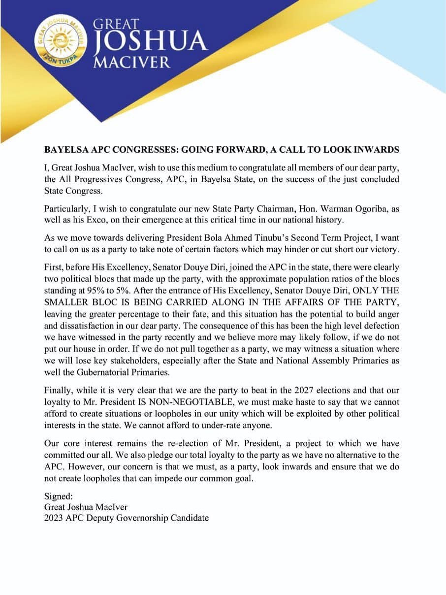 MacIver made the call in a statement issued in Yenagoa, where he urged party leaders to address emerging grievances and restore cohesion following the conclusion of the state congress. While congratulating members for a successful exercise, he also extended goodwill to the newly elected state chairman, Warman Ogoriba, and his executive, stressing the need for inclusive leadership at a critical time.