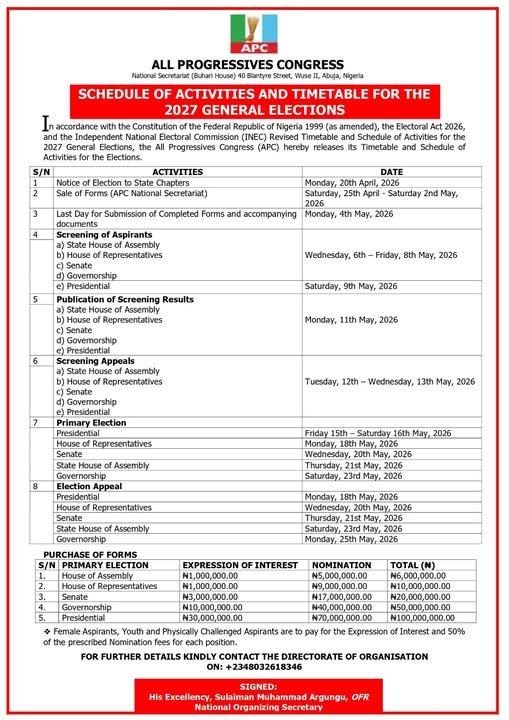 The All Progressives Congress (APC) has released a revised timetable and schedule of activities ahead of the 2027 general elections, setting the stage for early political maneuvering within the ruling party.