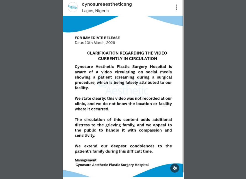 “Cynosure Aesthetic Plastic Surgery Hospital is aware of a video circulating on social media showing a patient screaming during a surgical procedure, which is being incorrectly attributed to our facility. We want to make it clear: this video was not filmed at our clinic, and we do not know where the procedure took place.”
