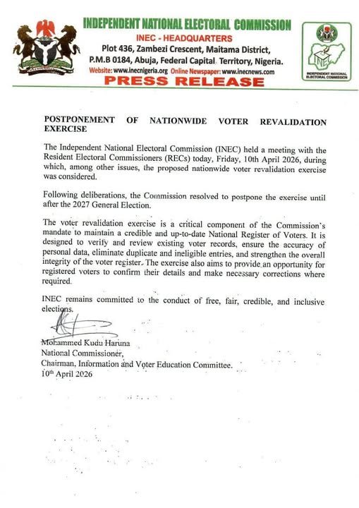 The Independent National Electoral Commission (INEC) has announced the postponement of its planned nationwide voter revalidation exercise until after the 2027 general elections.