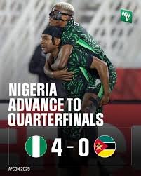 Nigeria advanced to the quarter-finals of the 2025 Africa Cup of Nations with a decisive 4-0 win over Mozambique in Fes.