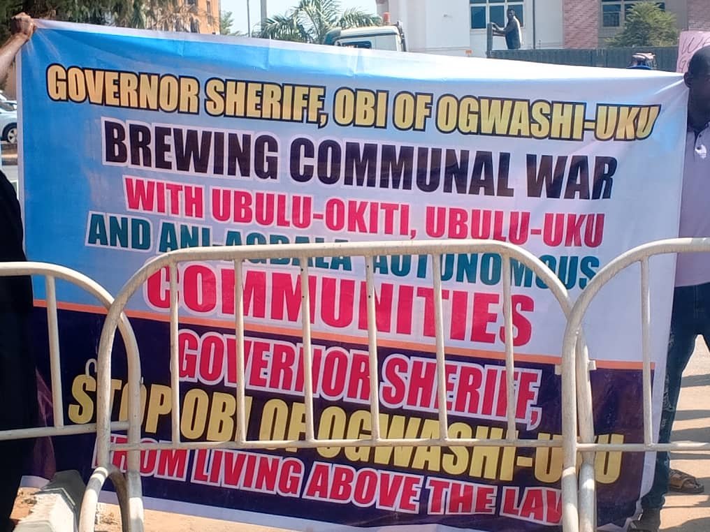 The protesters, led by the President General of the community, Patrick Osaamor, carried placards with inscriptions such as “Ogwashi-Uku does not belong to one family,” “Stop the oppression,” “Land belongs to the people, not the palace,” “Ogwashi-Uku does not belong to the Okonjo Family” and “Abolish the farming permit policy.”