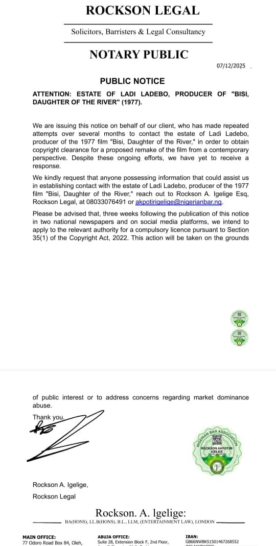 A fresh appeal has been released by Rockson Legal following months of unsuccessful attempts to reach the estate of the late filmmaker Ladi Ladebo, producer of the landmark 1977 Nigerian film Bisi, Daughter of the River. The firm disclosed that its client has made repeated efforts to secure copyright clearance for a contemporary remake of the classic but has received no response from any known representatives of the estate.