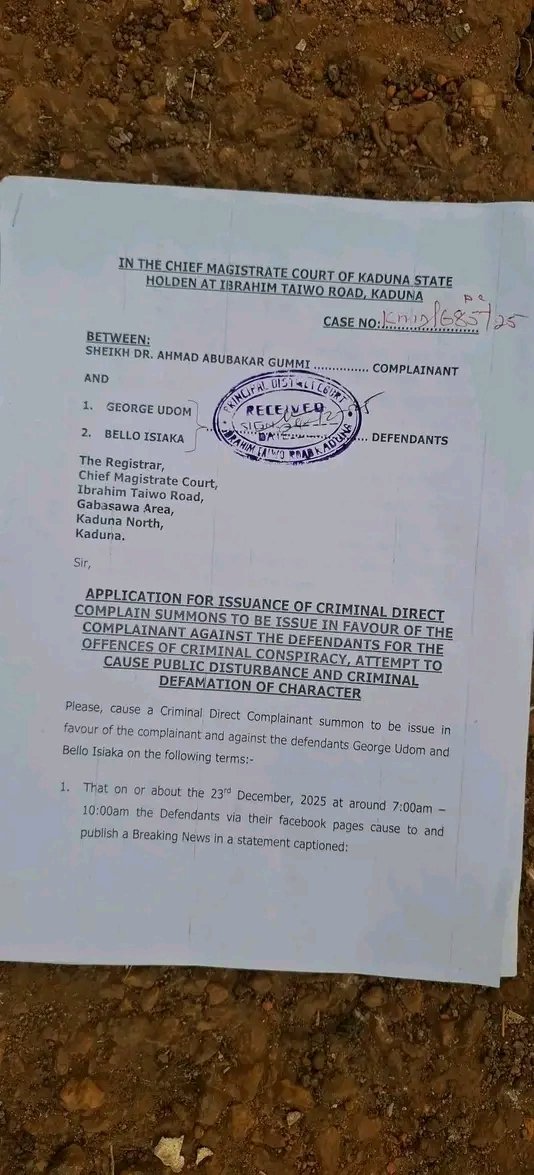 Sheikh Gumi filed a criminal complaint before a Chief Magistrate Court in Kaduna State, marked KMD/685/25, on December 24, 2025. The suit names George Udom and Bello Isiaka as defendants.